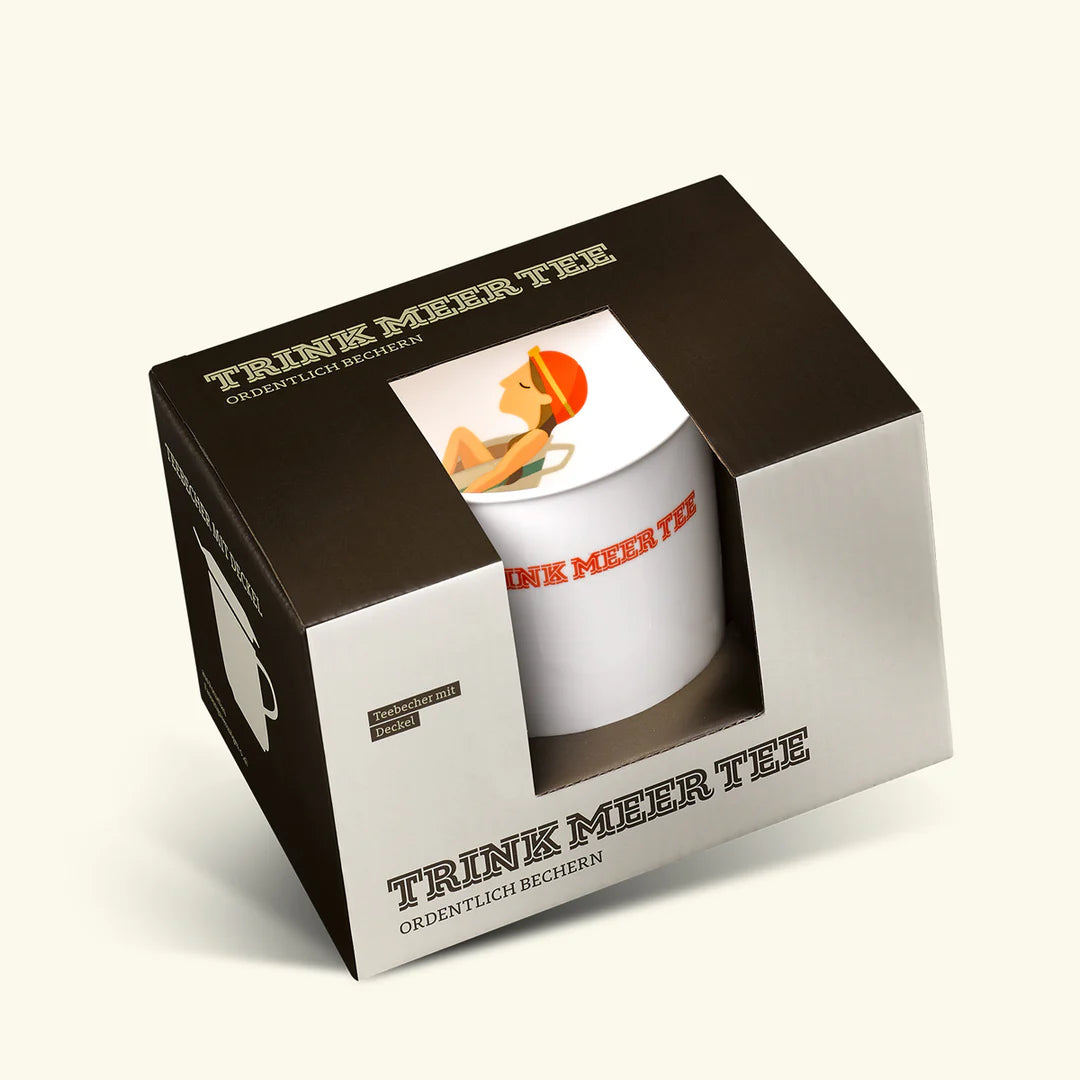Für Trink Meer Tee haben wir einen großen Becher entwickelt in dem eine ordentliche Portion Tee Platz findet. Auf der Innenseite dieses Bechers ist unter der Teeoberfläche unsere Badende in der Tasse aufgedruckt. Beim Trinken taucht sie langsam auf.